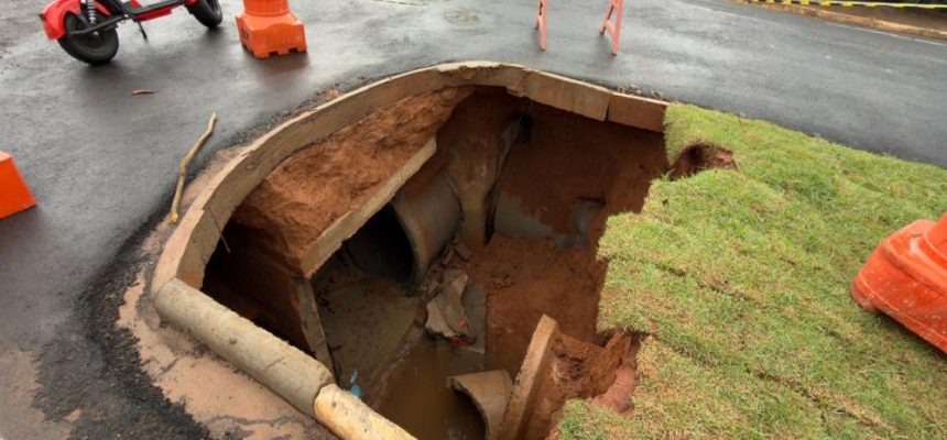O problema foi constatado após as fortes chuvas registradas no último sábado (13), que provocaram recalque na estrutura e erosão no asfalto. Embora a via tenha sido liberada recentemente para reduzir transtornos no trânsito, a obra de drenagem ainda estava em andamento. A Secretaria de Obras informou que o dano foi causado por serviço mal executado pela empresa contratada, situação que só se manifestou com o volume de chuvas.